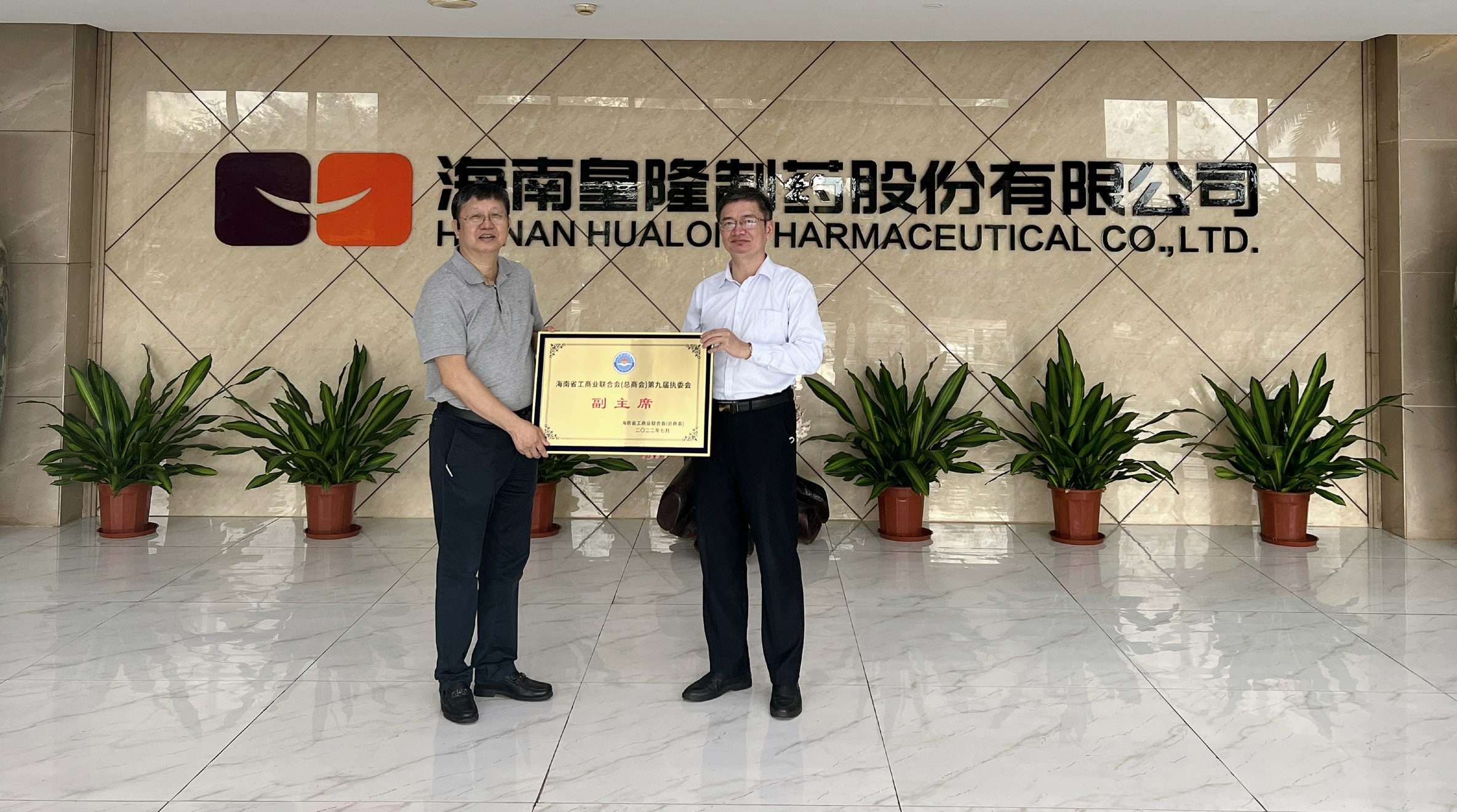 最后,林書記向陳董連任海南省工商業聯合會(總商會)第九屆執委會副主席表示祝賀,并頒發了牌匾。