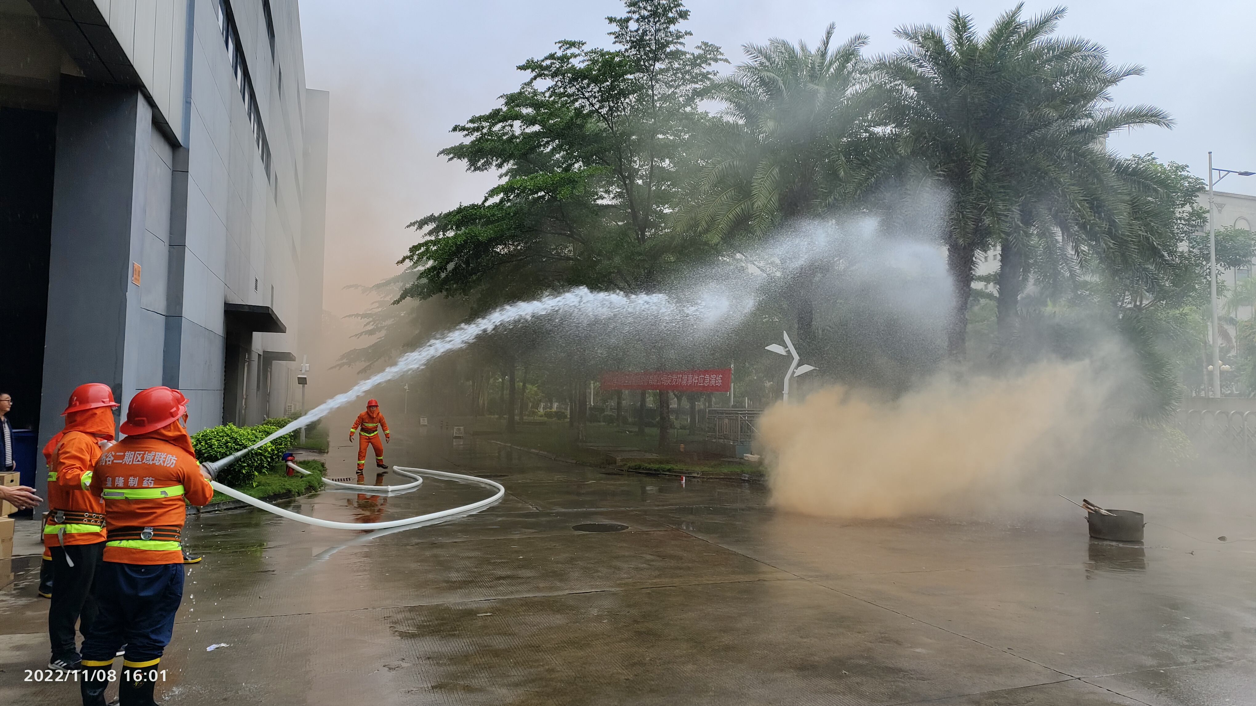 根據議程安排,全體與會人員來到戶外還進行了2022年度安全消防及突發環境事件應急演練。本次演練腳本共有三個模擬場景,分別是防恐防暴演練、突發環境事件演練、消防安全演練。