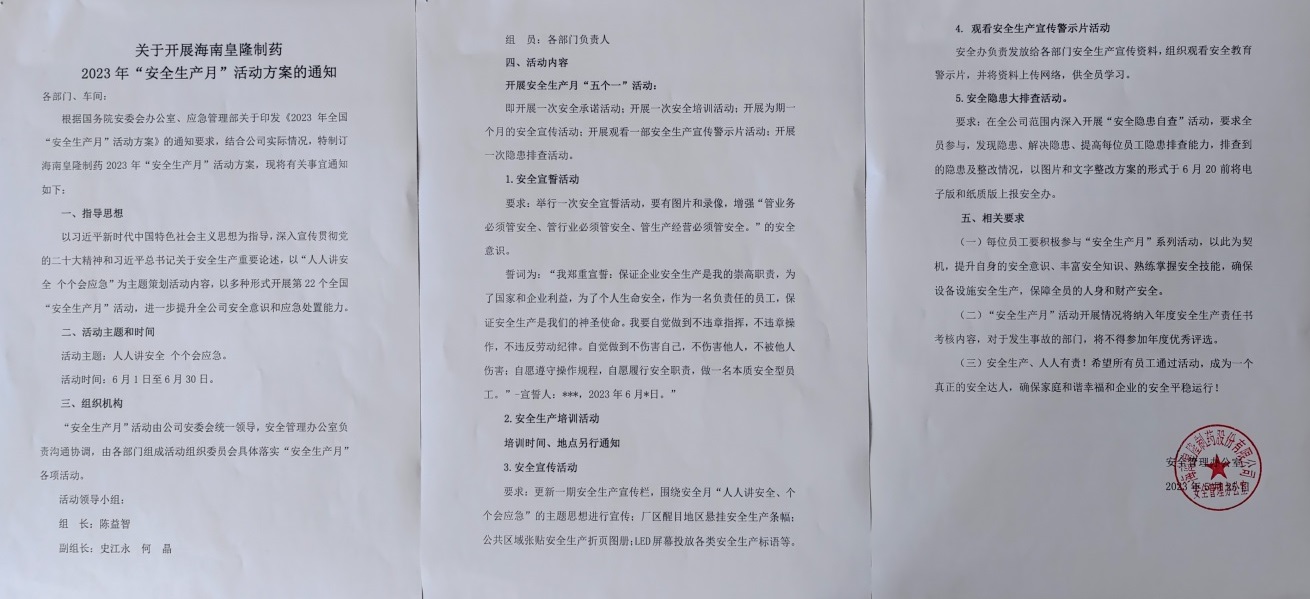 根據(jù)國家、省、市、區(qū)相關(guān)文件精神,結(jié)合公司實(shí)際,海南皇隆制藥股份有限公司制定了2023年“安全生產(chǎn)月”活動方案,并開展了以“人人講安全,個(gè)個(gè)會應(yīng)急”為主題的系列活動,進(jìn)一步提升了公司全員安全意識和應(yīng)急處置能力。